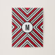 Un patrón de líneas y formas rojas, grises, negras y blancas se encuentran detrás del monograma. La inicial está dentro de un círculo blanco en el centro. La carta es negra.