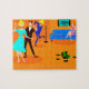 ¡Este Fiesta de cócteles Personalizado retro Jigsaw Puzzle no tiene un hueso introvertido en su cuerpo! El diseño moderno de mediados del siglo XIX cuenta con un vibrante dibujo personalizado de una sala de estar y un animado fiesta de cócteles. Hay una pareja atractiva en la pista de baile. La mujer rubia con un vestido turquesa y su alta, oscura y guapa escolta están bailando la cha-cha. En el suelo hay un récord verde rodeado de discos de vinilo. Contra la pared del fondo, una bonita cabeza roja está sentada en un sofá azul. Ella lleva un vestido rosa brillante. Su único accesorio es el vidrio martini en su mano. A su lado hay una lámpara de piso menos la sombra. ¿Dónde está la sombra? Está en la cabeza de un hombre tibio con traje azul que es claramente la vida del fiesta. También está sosteniendo un vaso de martini. Quienquiera que decorara la habitación no tenía miedo del color. Tiene una pared de ladrillo naranja y un suelo de naranja. En la pared que hay detrás del sofá hay un cuadro verde azulado y turquesa de un globo con un marco negro.