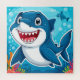 Cuidada representación artística de un tiburón azul sonriente en un entorno submarino rodeado de corales vibrantes.