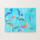 Dive into fun with this vibrant, personalized jigsaw puzzle featuring a mesmerizing underwater scene. Against a bright aqua blue background with gentle wavy lines, a circular school of colorful mermaid silhouettes in various poses creates a magical fantasy world. Customized prominently with the name "Vivian" in a cheerful pink font, this puzzle is an enchanting gift for children, mermaid lovers, or anyone who enjoys imaginative play and personalized items.