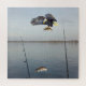 A los aficionados a la pesca, a los amantes de la naturaleza y a los deportes náuticos les encantará la imagen que tienen los medios de comunicación mixtos de un águila calva estadounidense en vuelo con una gran boca de lubina en las garras entre dos varas de pesca en un paisaje de arrogancia amplia, Shiloh, NC.
