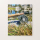 rompecabezas del lago montañoso de Sierra Nevada con caña de pesca de mosca y carrete