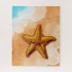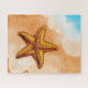 Rompecabezas en un ilustracion acuático de una estrella de mar con detalles texturados, descansando en una playa de arena con olas suaves y un salpicón de azul océano. La mezcla de tonos cálidos y agua fría le da un ambiente relajado y de playa.