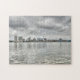 Aquí está el hermoso paisaje de Filadelfia visto desde el otro lado del río Delaware en la ciudad de Camden. Las nubes cuelgan sobre el cielo tormentoso y las reflexiones de los rascacielos se ven en el agua.
