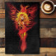 Mujer que es una llama con alas. Una mujer fénix con llama roja, naranja y amarilla en un fondo negro