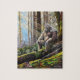 El legendario gran pie, también conocido como Sasquatch, se sienta en un bosque descansando. Un solitario y abandonado reposo de senderismo descansa en el pasto cercano.