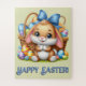 Adorable Rompecabezas de la Montaña de Pascua. Este lindo conejito con orejas doradas tiene un arco azul en el pelo y está rodeado de huevos coloridos y decorados. Happy Easter (Pascua feliz) está escrito en una tipografía divertida bajo el illludirecta. El tamaño que se muestra es de 16 x 20 con 56 piezas sobredimensionadas, pero también está disponible en 11 x 14 más pequeñas con 30 piezas sobredimensionadas. Este delicioso rompecabezas se hace en Estados Unidos y se entregará en una caja de regalo personalizado con este diseño impreso en la parte superior de la caja.
