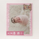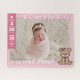 Baby girl photo birth announcement puzzles personalized with a large photo against a baby pink background. A teddy bear with a pink bow tie and a pink bow at the ear in one corner as a cute overlay on the photo of your newborn daughter. Her birth stats against a pink label where you can write down height, weight, time of birth, and date.