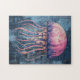 Una pintura al óleo de estilo rústico de una medusa rosa y violeta flotando elegantemente en un fondo azul profundo, mezclando belleza marina con ricos tonos morados.