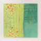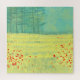 Un moderno cuadro paisajístico contemporáneo con una tranquila florida pradera de verano con pájaros volando contra el cielo y un bosque de pinos a lo lejos. Los colores amarillo y verde son frescos y edificantes. Arte original de Nic Squirrell.