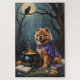 Entrar en una mágica noche de Halloween con esta pintoresca pintura al óleo con un adorable cachorro vestido con un mini manto de bruja, sentado al lado de un caldero burbujeante en un oscuro bosque. Rodeada de pociones brillantes, antiguos libros de ortografía y brillantes chispas mágicas, la escena está llena de misterio y encanto. Las ricas texturas de pintor y los profundos tonos de Halloween crean una acogedora atmósfera encantada perfecta para los amantes de la temporada espeluznante.