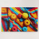 Este divertido rompecabezas con temática artesanal presenta coloridas bolas de hilo con ganchos de crochet en una manta de crochet.