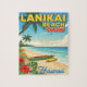 Escape al paraíso con esta vibrante postal de la playa de Lanikai. Este ilustracion tropical, que cuenta con canoas de gatillo, palmeras y olas turquesas, capta la serena belleza de la playa más emblemática de Oahu.