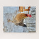 Este rompecabezas presenta una gallina de hornillos marrones parada frente a su casa de Connecticut en invierno después de una nevada.