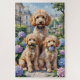 A refined Poodle family scene set in a stylish hydrangea garden. Featuring an elegant adult dog and two adorable puppies, this artwork captures beauty, charm, and sophistication—perfect for dog lovers and upscale decor.