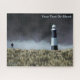 Una pintura de una figura humana solitaria mirando como una tormenta se acerca al faro alto del punto Spurn en Yorkshire. Añade tu propio texto.