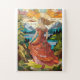 Esta vibrante obra de arte de cristal teñido representa a una hermosa mujer con un vestido ornamentado y fluido, su largo cabello ondeando con gracia mientras se encuentra en un paisaje rocoso. La mujer parece estar contemplando una vista impresionante que incluye montañas majestuosas, un lago sereno y un cielo dramático. La obra es rica en detalles, con paneles atrevidos y coloridos que crean un contraste dinámico entre la figura y la escena natural. El efecto vidriera realza la belleza del paisaje y la elegancia de la mujer, haciéndolo perfecto para una obra de arte poster o mural que irradia belleza y tranquilidad.