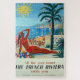 Impresión de reproducción de un poster francés Art Deco que promueve el viaje a la Riviera Francesa con una mujer en bikini contra la hermosa playa de la costa mediterránea.
