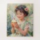 A puzzle with an illustration of a pretty Asian girl with flowers in her hair holding a cupcake with white wings and a vintage dress done in an impasto vintage style.
