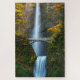 Hermosa y tranquila escena en este rompecabezas con un puente blanco frente a una cascada en un bosque verde.
