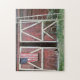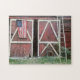 Puzzle Puertas antiguas de granero rojo con bandera y pla