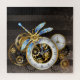 Diales antiguos de oro y bronce, decorados con libélula mecánica sobre fondo marrón, rayado. Steampunk.