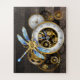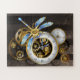 Diales antiguos con artes de oro y latón, decorados con libélula mecánica sobre fondo marrón, rayado. Steampunk.