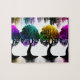 Este diseño abstracto único es de una hilera de cuatro árboles coloridos uno al lado del otro. Las hojas abstractas son vibrantes y variadas, desde moradas, amarillas, azules y de fondo blanco.