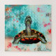 Representación dibujada a mano de una tortuga con un fondo abstracto. Colores utilizados: rojo, azul, verde azulado, verde, amarillo, morado.