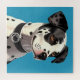 Una ilustración detallada de un perro dálmata con un collar de cadena, aislado sobre un fondo azul vívido, capturando su apariencia encantadora y elegante a través de un enfoque artístico.