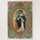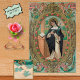 San Rosa de Lima (1586-1617) quería convertirse en monja, pero su padre se negó a permitirla. Sin embargo, al final se le permitió unirse a la Tercera Orden de Santo Domingo para vivir su apostolado en casa. + En este retrato estilizado, St. Rosa se encuentra junto a un prie-dieu o arrodillado. Un libro abierto yacía en su estante. Santa Rosa está vestida con un hábito dominicano que consiste en una mella blanca, bata de color crema y escapular, cinturón negro y rosario, y un velo y manto negro. En su cabeza, usa una corona de espinas como Santa Catalina de Siena, su modelo a seguir, en lugar de su atributo más usual: una corona de rosas. (Sin embargo, los Rosas se incorporan al elaborado marco oval del cuadro). En su mano derecha, ella sostiene un rociado de mentiras que indican su condición de virgen consagrada. Más allá de la pared baja que separa el primer plano del fondo, se encuentra un paisaje tropical peruano. + Un elaborado marco de madera dorada falsa rodea la imagen. En la parte superior, dos niños putti o pequeños regordetes con alas sostienen bandaroles rosados inscritos en "Rosa" y "Limensis", es decir, "Rosa de Lima" en latín. Figuras frontales de una mujer en la cima y un hombre en la parte inferior, así como dos figuras masculinas en perfil con tocados de plumas a los lados del marco aluden a los indígenas del Perú. Rosas, rociados de lirios, vegetación y cintas y arcos rosados embellecen aún más el marco. + San Rosa de Lima es el primer católico en las Américas en ser declarado santo. Es patrocinadora de jardineros y floristas, así como de Perú, América y Filipinas. + Festín: 23 de agosto + Crédito de la imagen (K 48): Imagen antigua de San Rosa de Lima, de La Vie des Saints de Henry Riancey: ilustrée en cromolithographie, d'aprè s les manuscrits de tous les sicles, publiée par F. Kellerhoven (París: Librairie-Deflorenne, 1874]), f. p. 288, de la biblioteca privada del diseñador. Franz Kellerhoven (1814-1872), cromolitografo, fue un sacerdote-artista alemán que emigró a París y estableció allí una imprenta. Se especializó en obras de arte basadas en manuscritos medievales, pero también hizo litos de pinturas y obras arquitectónicas antiguas.