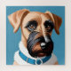 Retrato ilustrado de un perro terrier con ojos expresivos, que lleva un collar azul contra un fondo vibrante. El estilo de arte moderno combina el realismo y la creatividad, resaltando las características únicas y el encanto del animal.