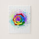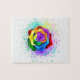 Rosa grande y floreciente con pétalos de arco iris sobre fondo blanco, pintado con salpicaduras de pintura colorida y brillante. 3.ª