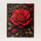 Composición floral bellamente diseñada con grandes rosas rojas vibrantes intercaladas con flores más pequeñas y hojas doradas ornamentadas