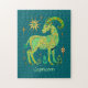 Rompecabezas en una representación estilizada de una cabra, intrincadamente decorada con patrones de verde y amarillo, representando el signo zodiaco Capricornio. Los elementos que lo rodean incluyen símbolos celestes y diseños de hojas.