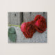 Un rompecabezas con una foto de dos rosas rojas sobre un fondo de madera de pino.
