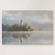Rompecabezas con una salida del sol de niebla en el lago Bled con la isla con la iglesia y la niebla con la reflexión en el agua en la primera luz del sol de la mañana en otoño en Eslovenia.