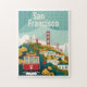 Captura el emblemático encanto de San Francisco California con esta vintage imagen de estilo poster. Un clásico teleférico rojo recorre con gracia las calles de la ciudad, ofreciendo un vistazo de la bulliciosa ciudad. Al fondo, el majestuoso puente Golden Gate se erige alto en el marco de un día soleado, añadiendo un toque de belleza intemporal a la escena. Tanto si eres un aficionado a la estética de viajes vintage como si simplemente te has atraído por el encanto de los monumentos de San Francisco, esta obra de arte seguramente evocará un sentimiento de nostalgia y de pasión por los paseos. Este diseño vintage traerá recuerdos de afiches clásicos de viajes de una época pasada.