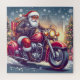 Ce design montre le Père Noël portant une veste en cuir noir et un bonnet de Noël. Il conduit une moto rouge avec un sac de cadeaux sur le dos. Le fond est un paysage urbain enneigé avec des arbres de Noël et des immeubles.