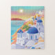 Un maravilloso rompecabezas con un ilustracion dibujado a mano de Santorini, Grecia.