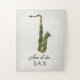 Diseño de mármol saxofón que dice "Sobre todo... saxofón". Mármol verde con acentos dorados en un fondo neutro.