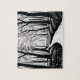 El diseño es un dibujo en blanco y negro de un camino en un bosque. Hay un pequeño sendero a pie a través de este bosque donde los observadores notarán hojas púrpuras abstractas sobrevolando el bosque.