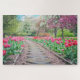 En la fotografía temática de la primavera se puede contemplar un camino ajardinado bordeado de bonitos tulipanes rosas, verdes y blancos floridos a lo lejos.