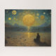 En esta pintura surrealista, que recuerda al estilo de Van Gogh, presenciamos un mundo de ensueño: una playa serena donde la realidad parece alterada, casi alucinante. El mar, bello y etéreo, bordea este mundo surrealista. Lo más llamativo es el cielo, salpicado de miles de lunas, cada uno arroja su propia luz suave y crea un mosaico fascinante de belleza lunar. Esta escena invita a la contemplación, combinando la tranquilidad de un entorno de playa con la calidad surrealista y onírica de las múltiples lunas. Es una representación visual de un mundo surrealista, donde lo común se transforma en lo extraordinario, y la playa familiar se convierte en una puerta de entrada a un reino de imaginación y maravilla.