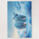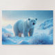 Un diseño de rompecabezas fotorealista que presenta a un oso polar majestuoso parado en un paisaje nevado durante la puesta de sol. El oso se enfrenta directamente al espectador, con una mirada seria y enfocada. Su suave y cálida luz ilumina su piel blanca, creando un ambiente tranquilo y sereno. Los copos de nieve caen suavemente en el fondo mientras el sol se pone sobre el tranquilo y helado paisaje. Una hermosa mezcla de fuerza, calma y belleza natural, perfecta para los amantes de la vida silvestre y los aficionados al rompecabezas.