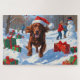 Un bonito Red Setter irlandés recorre alegremente el paisaje nevado, usando un gorra festivo de Navidades rojos. Esta vibrante escena invernal resalta el sedoso abrigo rojo de la raza, el espíritu enérgico y la naturaleza afectuosa mientras se celebra el calor y la magia de la temporada navideña. Un diseño animado y lleno de encanto festivo