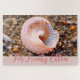 En la orilla, sobre guijarros y piedras de color tierra, hay una elegante concha rosa de bonito. Este encantador rompecabezas de playa está muy bien adaptado con texto, perfecto para una dedicación, cita inspiradora o regalo personalizado.