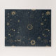 El bonito diseño celeste presenta una rueda zodiaca en tonos dorados pálidos sobre un fondo azul de medianoche.