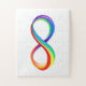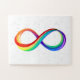 Símbolo claro de infinito de capas plásticas de colores saturados rojo, amarillo, verde, turquesa, azul y violeta sobre fondo blanco.
