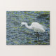 Este rompecabezas presenta una imagen de un Egret de Nieve en las aguas de un lago verde azul.